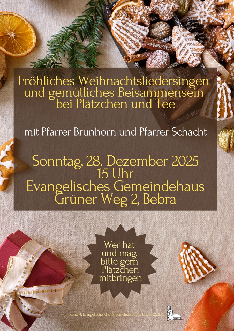 Sonntag, 28.12.2025, 15:00 Uhr Weihnachtsliedersingen im Gemeindehaus mit Pfr. Brunhorn und Pfr. Schacht und gemütliches Beisammensein bei Plätzchen und Tee.
